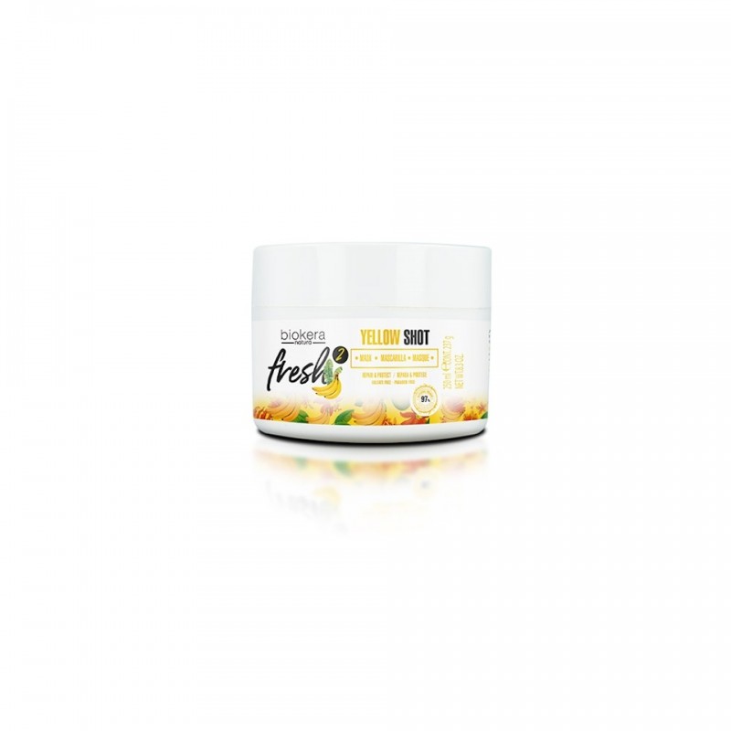 The Salerm Biokera Fresh Yellow Shot Mask Intensive repairing and protective mask based on a yellow cocktail for hydrated, shiny, and frizz-free hair.