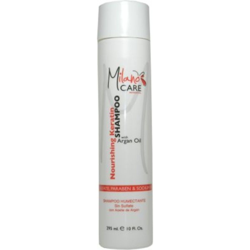 Milano Care Nourishing Keratin Shampoo with Argan Oil 295ml/10oz. Is a sulfate, Sodium Chloride and Paraben free shampoo developed for dry hair or to preserve Milano Kerartin Hair Smoothing Treatment.