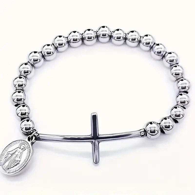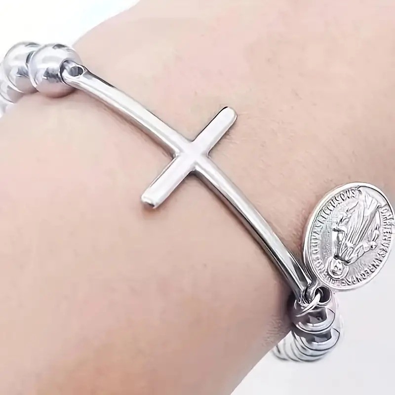 1pc Stainless Steel Bracelet, 8MM Bead Religious Cross Bracelet Unisex